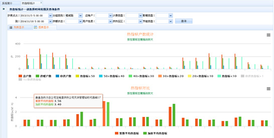 數據統計:運行分析、能耗分析、供熱信息匯總、熱表對比、歷史同期對比、單耗統計分析、供暖示意圖。