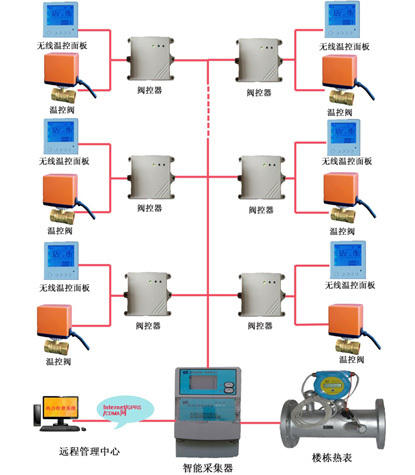 時間面積通斷法熱計量控制系統(tǒng)是由溫控器,閥控器,樓棟熱量表和MBUS熱表采集器組成。溫控器安裝在用戶房間內(nèi),閥控器安裝在管道井里,溫控器和閥控器采用無線通訊。而MBUS 采集器則通過MBUS 總線采集閥控器的溫度和開關(guān)閥時間比例與熱量表的熱量數(shù)據(jù),將熱量數(shù)據(jù)分?jǐn)偟矫恳粋€用戶。